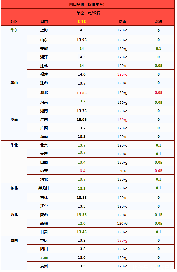 因此,在供需博弈下,目前,生猪市场,利好支撑有限,利空压力较高,短暂猪价或将延续磨底的走势,标猪均价或将继续走低!从数据了解,受屠企调价,预计,8月18日,外三元瘦肉型标猪价格出栏均价在13.75元/公斤,后市关注集团猪企出栏节奏的变化以及二育入场的变化!