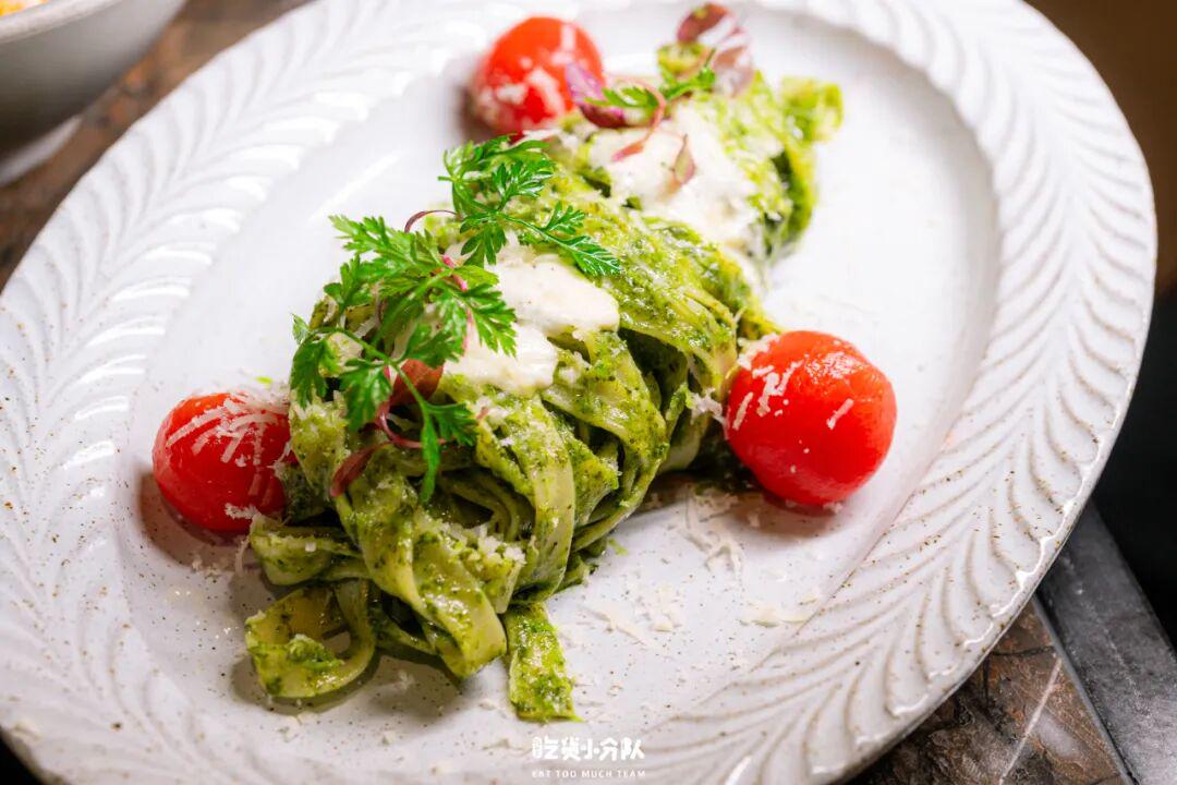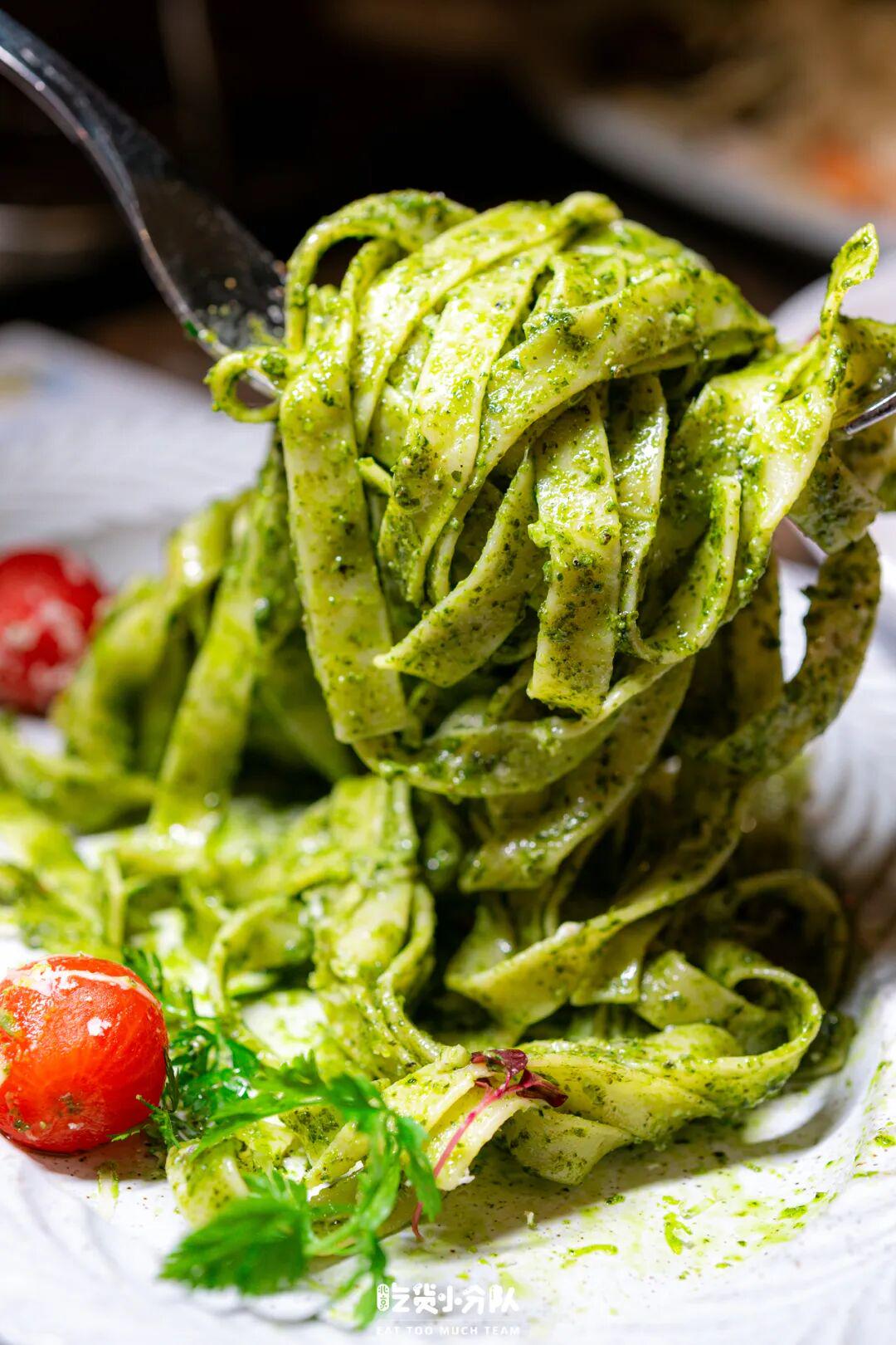 意大利家庭口味的经典青酱意面,在帕奇诺也能吃到。浓郁的罗勒酱加上融化的布拉塔芝士,每一根宽面上都挂汁!旁边还有小番茄来爆汁解腻~