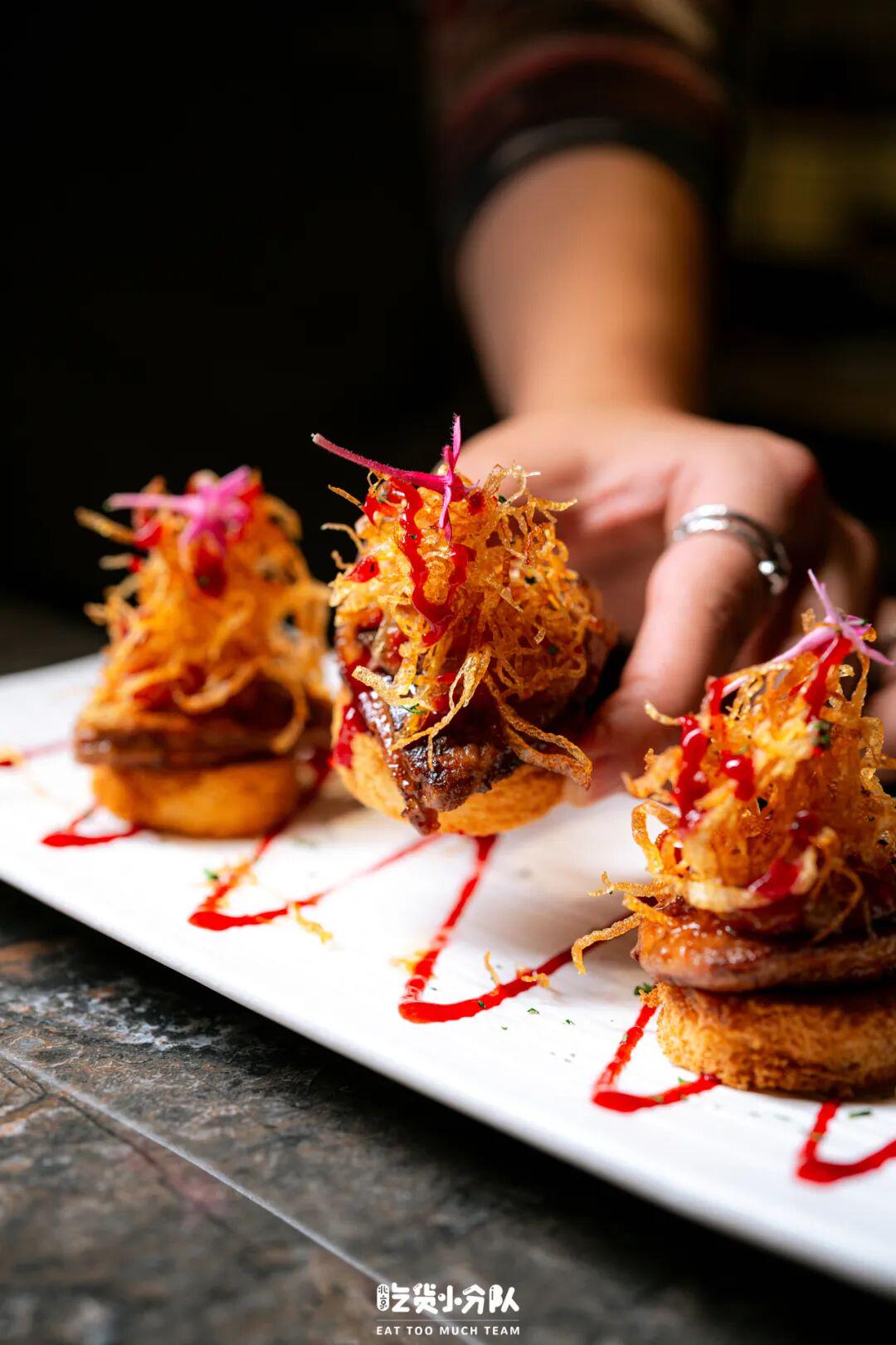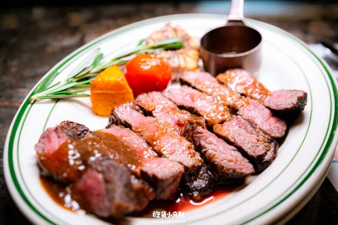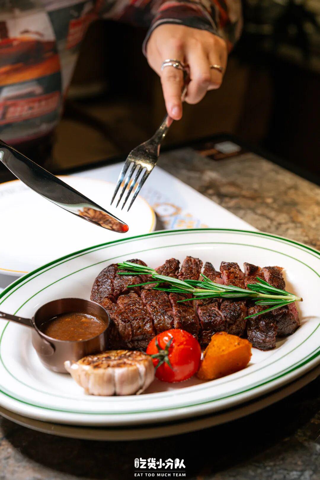 屡次斩获世界冠军的澳洲凤凰和牛,取自牛外脊部位。油花分布均匀,经过高温烤制后鲜嫩多汁,每一口都是肉香与脂香的融合。随餐还搭配了新鲜时蔬,肉食爱好者必点。另外店里还有肉眼、菲力、T-Bone等多样选择。