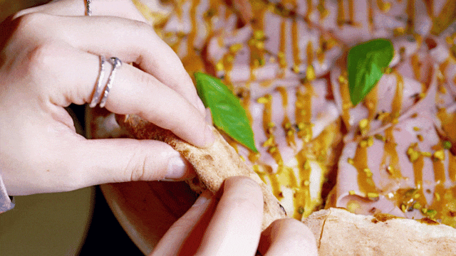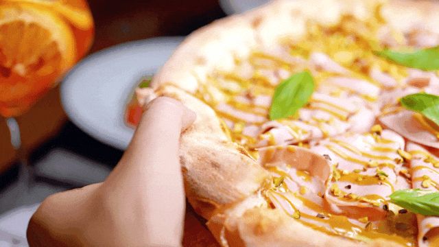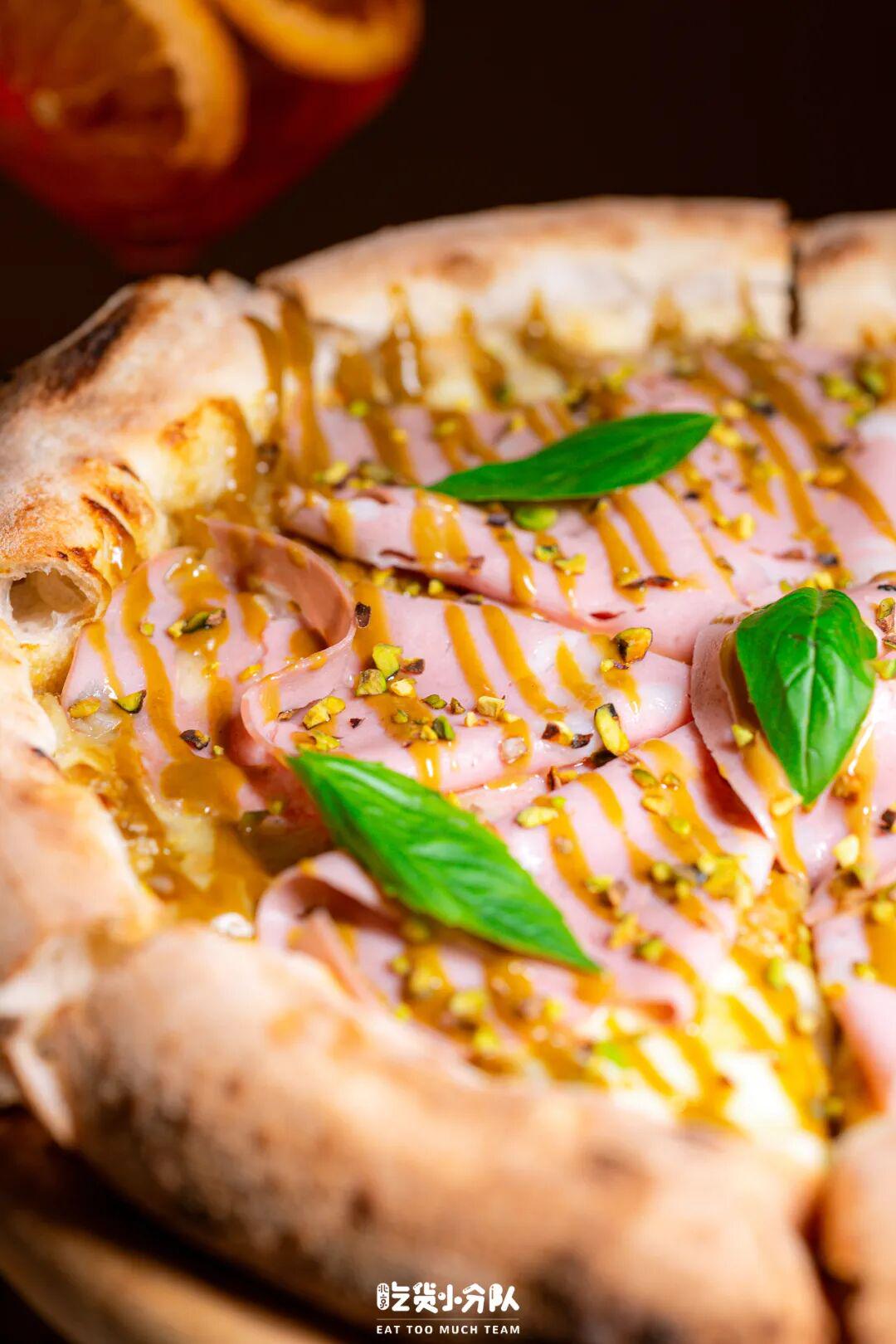 推荐最近很火的【开心果火腿披萨】,窑炉烤制的披萨让香气进一步融合,标志性的豹纹披萨边,酥脆又有韧劲。 饼底的开心果酱,味道馥郁香浓,还有开心果颗粒点缀其中,顶部搭配火腿,每一口都很满足。