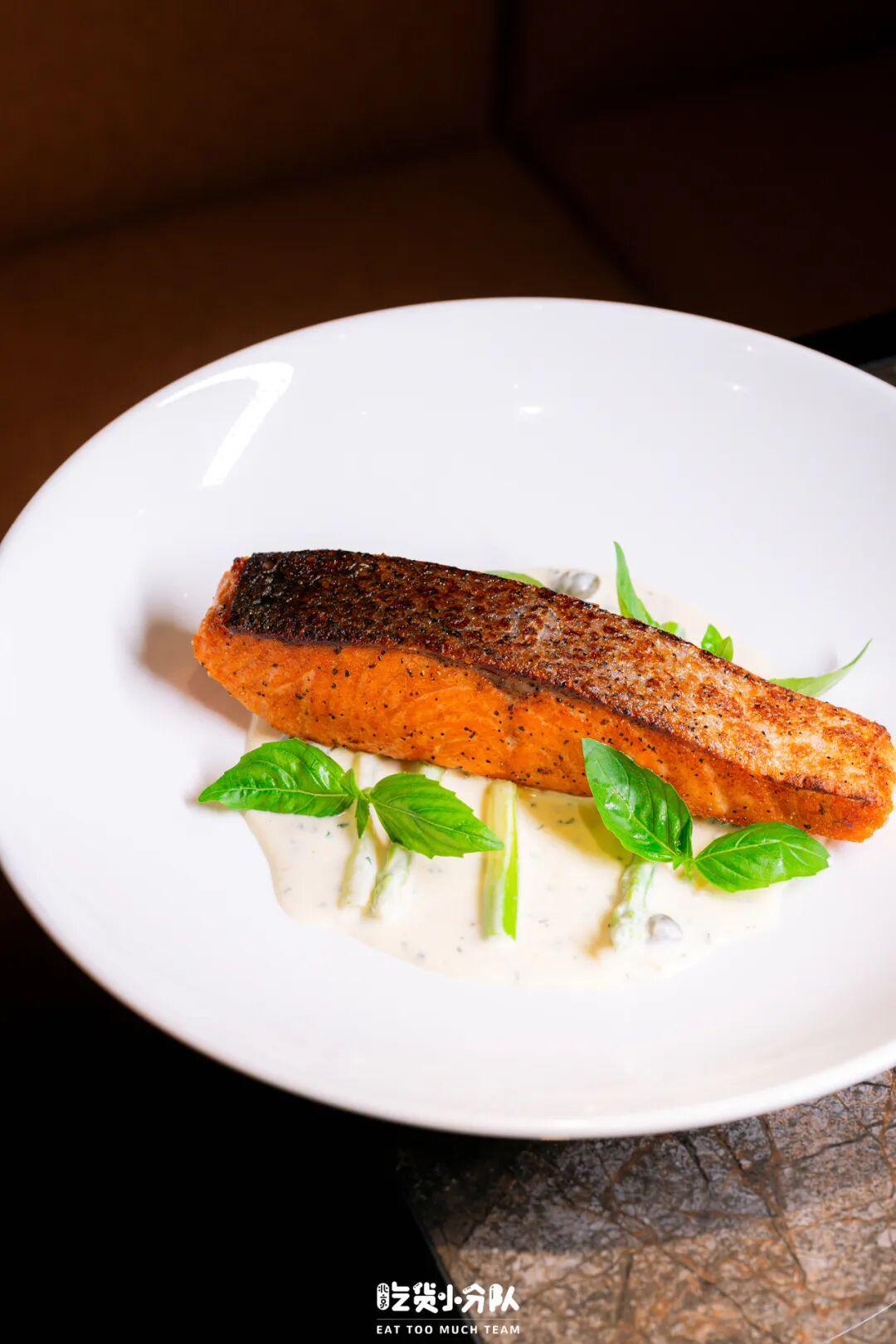 外焦里嫩的三文鱼,搭配奶油柠檬汁和芦笋